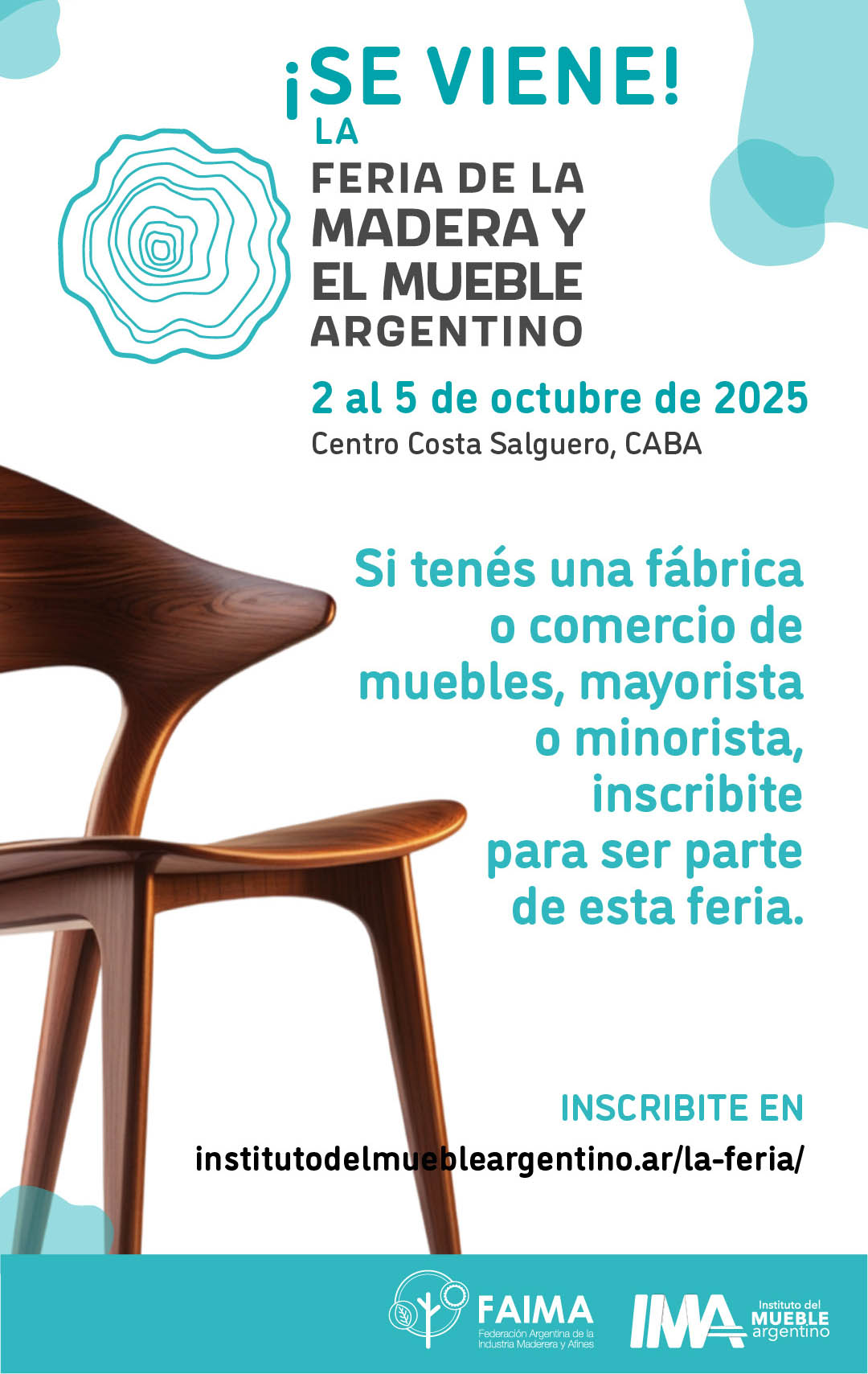La Feria de la Madera y el Mueble Argentino tendrá lugar del 2 al 5 de octubre próximos en el Centro Costa Salguero de la Ciudad Autónoma de Buenos Aires, organizada por la Federación Argentina de la Industria Maderera y Afines (FAIMA) y el Instituto del Mueble Argentino (IMA). Busca visibilizar y comercializar muebles y bienes finales en general diseñados y producidos en la Argentina. Esta es la única Feria de este tipo en Buenos Aires y hace especial foco en innovación, calidad y tendencia.