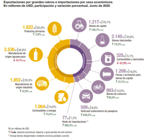 La actividad económica mostró signos de recuperación en mayo de 2025, según los datos del Estimador Mensual de Actividad Económica (EMAE) que publica el INDEC. El indicador registró una variación interanual de +5%. Sin embargo, en términos desestacionalizados, la actividad económica experimentó una leve contracción del -0,1% en comparación con abril. El análisis sectorial vuelve a revelar un panorama mixto en la economía. Entre los sectores que impulsaron el crecimiento del EMAE se destacaron la intermediación financiera con un notable aumento del 25,9% i.a., seguida por pesca con un 12,2% i.a.. El comercio mayorista, minorista y reparaciones también contribuyó positivamente con un crecimiento del 10% i.a.. La industria manufacturera creció 5,0% interanual. Por el contrario, algunos sectores experimentaron caídas en su actividad durante mayo. La electricidad, gas y agua registró una disminución del -1,9% i.a., mientras que administración pública y defensa; planes de seguridad social de afiliación obligatoria se contrajo -0,9% i.a.. Estos sectores restaron aproximadamente 0,2 puntos porcentuales al crecimiento interanual del indicador. La evolución temporal del EMAE muestra una evolución pausada, con riesgos de adentrarse en un proceso de estancamiento. En ese sentido, las ventas de los supermercados cayeron 1,2% i.a. en mayo, aunque se recuperaron 6,1% i.a.. Por su parte, los autoservicios mayoristas tuvieron una leve recuperación de 0,7% i.a. en el mismo mes, pero las ventas se contrajeron 4,9% comparadas con mayo de 2024. En los primeros cinco meses del año la caída en los autoservicios mayoristas es de 6,3%, mientras que los supermercados recuperaron 4,6%. Los shoppings, por su parte, tuvieron un incremento de 6,2% i.a. en las ventas. En lo que respecta a la venta de vehículos, en junio se patentó un total de 36.676 automóviles: 0,5% menos que en mayo, pero 87% más que en junio de 2024. En el primer semestre del año, se patentó un 85% más que en el mismo período del año pasado. El 74,4% de los automóviles patentados fueron de origen importado, mientras que el 25,6% restante fueron de origen nacional. Evidentemente, el consumo de bienes masivos está siguiendo una evolución más contractiva en comparación con bienes más de tipo suntuarios (automóviles 0km e indumentaria, electrodomésticos, entre otros, en centros de compras), y particularmente de origen extranjero. Las importaciones volvieron a incrementarse en el mes de junio, y nuevamente en mayor medida que las exportaciones, según los datos del Intercambio Comercial Argentino (ICA) publicados por el INDEC. Las importaciones subieron 35,9% i.a., y las exportaciones lo hicieron en +10,8%. Como resultado, el intercambio comercial total se incrementó 21,2% i.a., alcanzando los 13.645 millones de dólares. El saldo comercial fue positivo por 906 millones. Los productos primarios lideraron las exportaciones con USD 1.822 millones (25% del total), experimentando un crecimiento del 2,6% interanual. Las manufacturas de origen agropecuario siguieron con USD 2.536 millones, prácticamente sin variación (caída del 0,1%) respecto a junio de 2024, y representaron el 34,9% del total. Las manufacturas de origen industrial alcanzaron USD 1.852 millones (25,5% de participación) con un crecimiento de 12,5% interanual. Los combustibles y energía contribuyeron con USD 1.064 millones (14,6%), mostrando un elevado incremento del 74,2%.